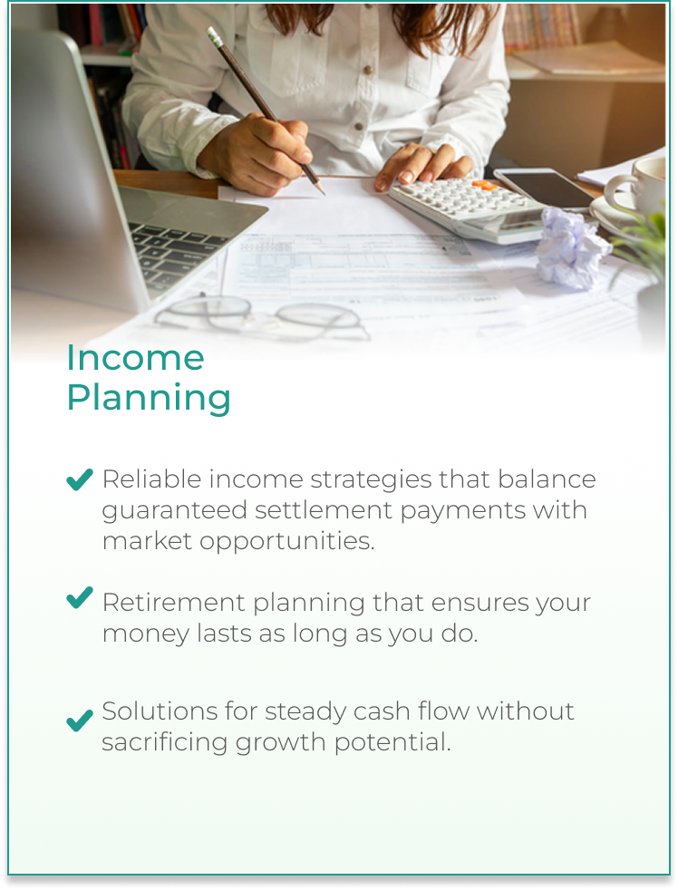 At LegalStream, we know your settlement is more than a payout—it’s the foundation for your future. Our financial planning services help you protect, grow, and pass on your wealth with confidence and peace of mind.