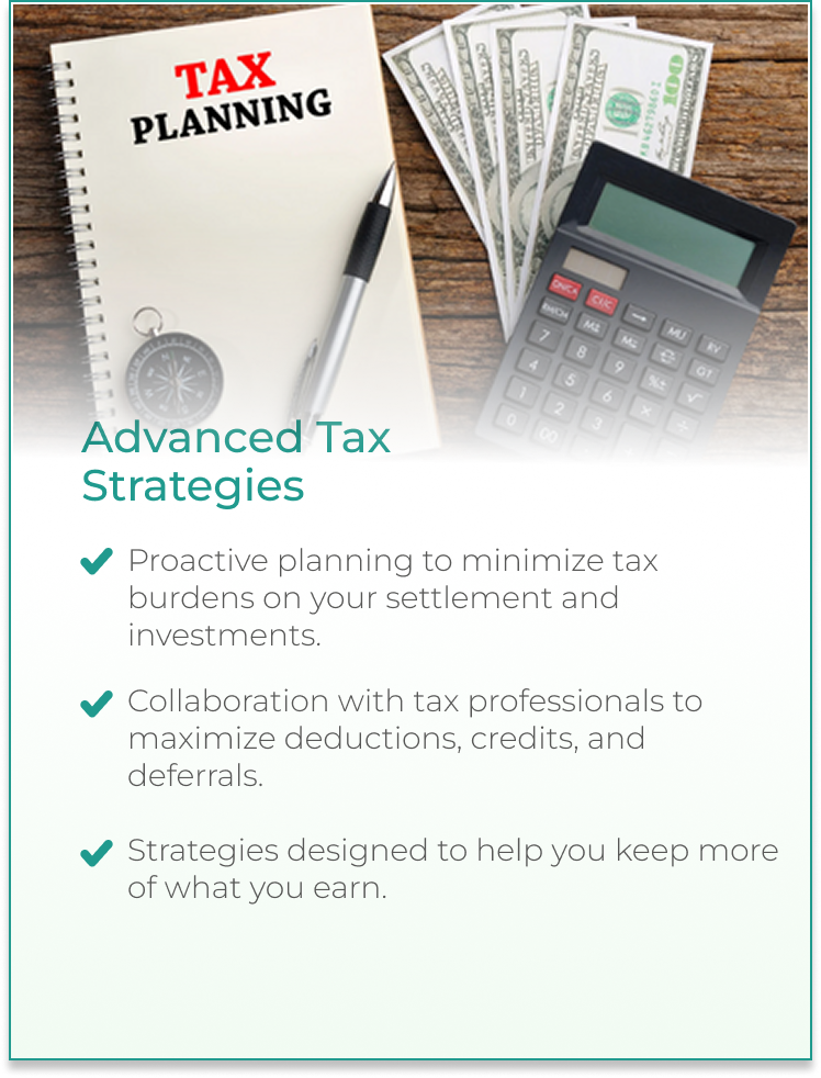 Proactive planning to minimize tax burdens on your settlement and investments.